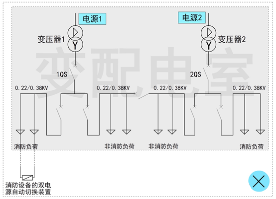 1、对于采用双回路供电的消防设备,应确保两个回路分别来自不同的电源和母线段(参见图示1),当某一电源或母线出现故障时,另一电源仍能正常使用。